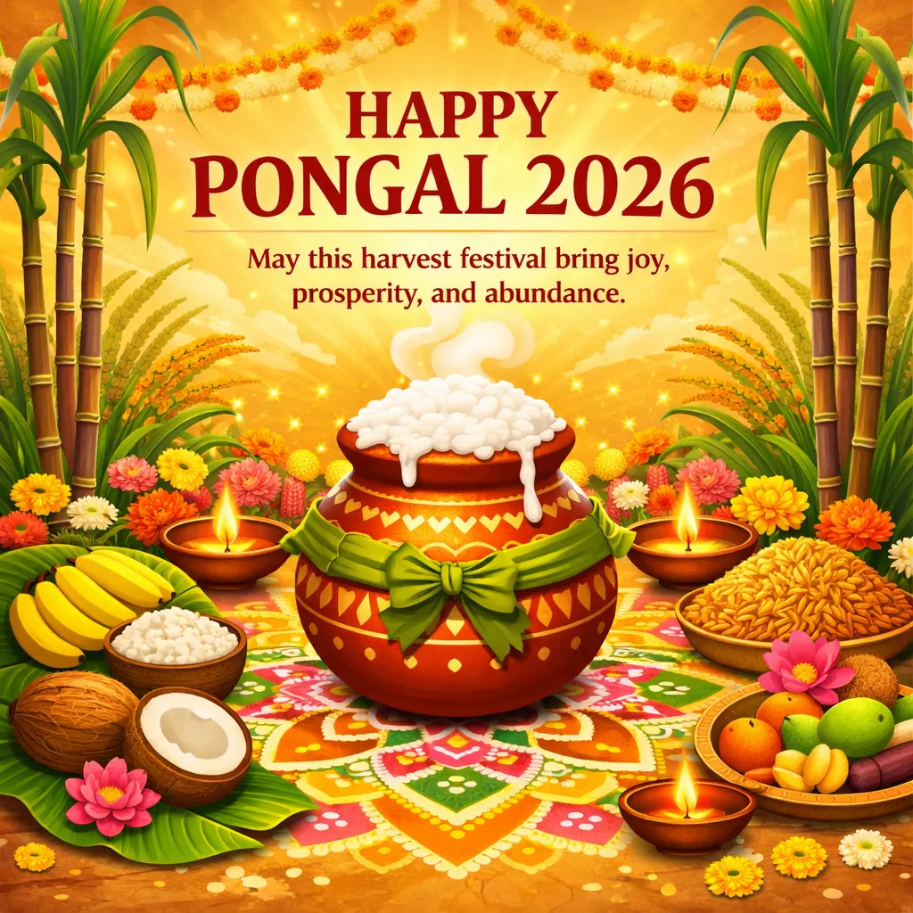 Happy Pongal 2026 is a joyful and culturally rich harvest festival celebrated with great enthusiasm, especially in Tamil Nadu and among Tamil communities worldwide. Pongal is a time of gratitude—towards nature, the Sun God, farmers, cattle, and the Earth—for blessing us with prosperity and abundance. In 2026, Pongal brings families together to celebrate traditions, prepare delicious dishes, decorate homes with kolams, and share happiness through images, wishes, and GIFs on social media and messaging platforms.